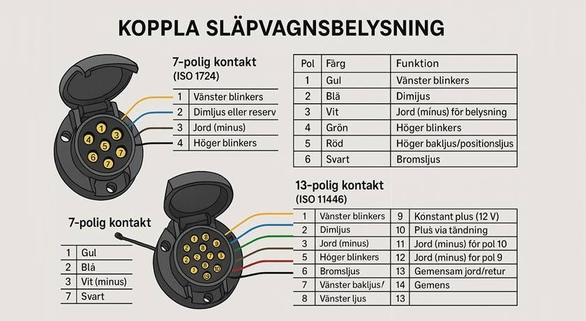 Välj rätt typ av släpvagnskontakt efter släpets behov: 7-polig för enklare belysning, 13-polig för husvagn eller extra funktioner. Känn till varje pols funktion, använd adapter vid behov och underhåll kontakten regelbundet. Då kör du både säkert och lagligt.